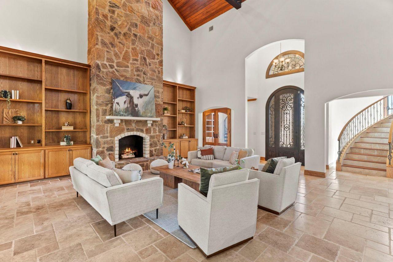 Set in the prestigious La Ventana subdivision of Driftwood, Tx, 2180 La Ventana Parkway is a stunning 5,200+ sq ft home on a beautiful lot. This elegant residence combines timeless craftsmanship with recent updates for an exceptional Hill Country lifestyle.An oversized iron front door opens to Travertine floors, Venetian plaster living room walls, cathedral beamed ceilings, and a stone fireplace with hearth. Custom iron doors lead to expansive outdoor living. The bar room features wine shelves, brick wall, and arched door. Gourmet kitchen highlights include a large center island w dual sinks & 2 dishwashers, KitchenAid commercial grade range w 6 burners, griddle & double ovens, pot filler, large pantry, & built-in glass cabinetry. A 2-story office w custom bookshelves connects via spiral staircase to a 2nd-level library.Downstairs primary suite offers tray ceiling, French doors to patio, remodeled bath w soaking tub & walk-in shower, plus dual California Closet walk-ins. A private MIL suite has separate driveway access & walk-in closet. Upstairs, three large bedrooms each include en suite baths and spacious walk-ins, plus a wood-floored game room w bar sink, large windows, and balcony access.Updates include: new metal roof (2024), Pella windows (half home, 2023), exterior painted (2022), full interior painted (2025), ceiling fans replaced (2021), upgraded dishwasher (2021), whole-house surge protector (2021), main HVAC replaced (2022). Outdoor kitchen remodeled 2023 w new countertops, BBQ pellet grill, sink, storage, & pass-thru window. La Ventana offers upscale rural living: tree-lined views, longhorns grazing, custom homes on acreage. Gated privacy, equestrian trails/corral, clubhouse w/ fitness, event space & kitchen; tennis/pickleball, basketball, golf range, playscape, park w/ Flat Creek access, hiking trails. Welcoming community with social activities. This Driftwood treasure delivers luxury, privacy, and modern conveniences?ready for new owners.